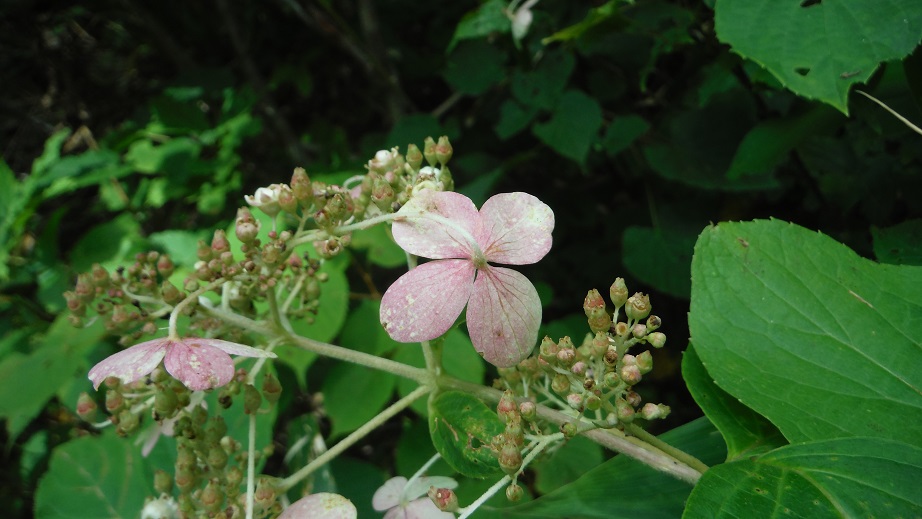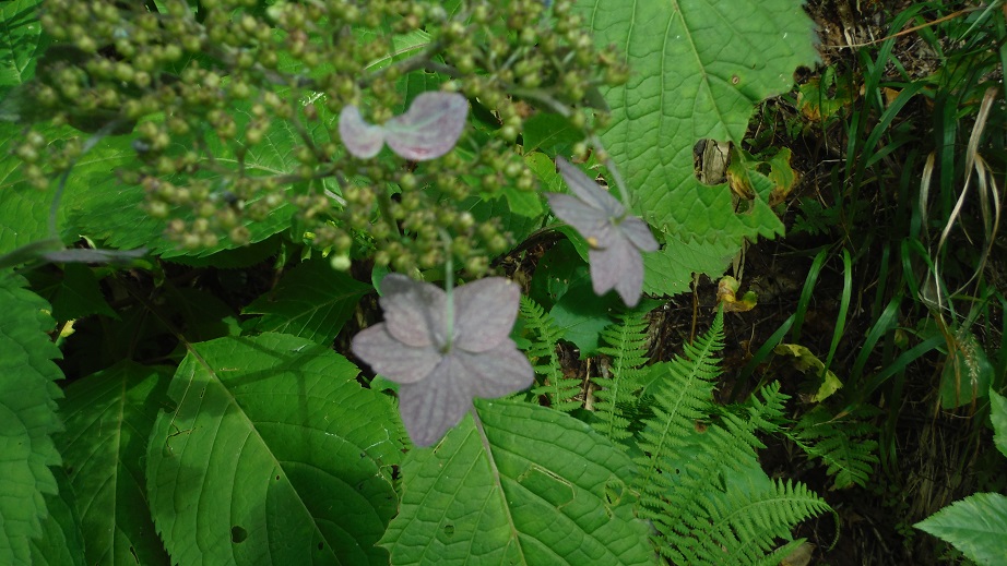 意外なことに、もう終わりと思っていたアジサイがこのルートではまだ多く見られました。様々な色合いが有ってそれぞれに群生していて楽しめました。淡いブルーのアジサイ↓